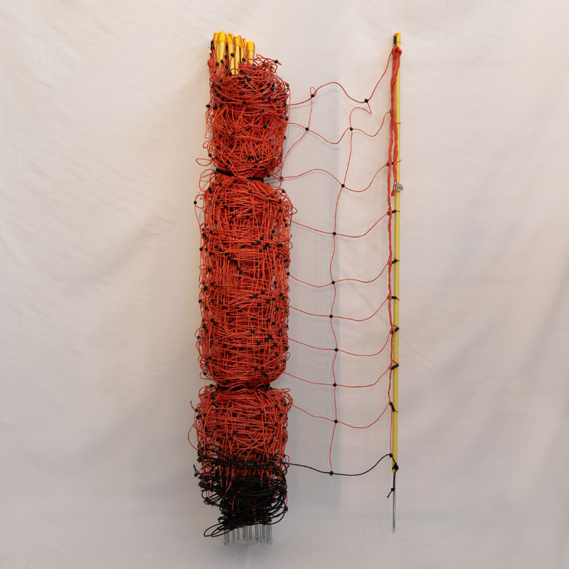 Rete elettrificabile, altezza 108 cm, lunghezza 50 mt, con 14 picchetti gialli a punta singola, solo da srotolare e piantare nel terreno. La rete è elettrificata dalla seconda linea in su, solo orizzontalmente (la prima vicino al terreno è rinforzata ma non elettrificata per evitare dispersione di corrente a terra). Comprende 3 conduttori in acciaio inox da 0,20 mentre il filo superiore ne conta 5 più 1 in rame da 0,25. La distanza fra le prime 5 linee orizzontali è di 9 cm, successivamente 2 da 13 cm, una da 15 cm e una da 18 cm, la larghezza di tutte è di 10 cm. All’inizio di ogni rete vi è una piastrina in metallo dove collegare l’elettrificatore o un’altra rete. Peso 7 Kg